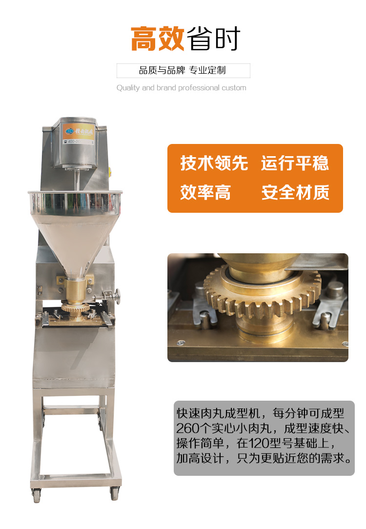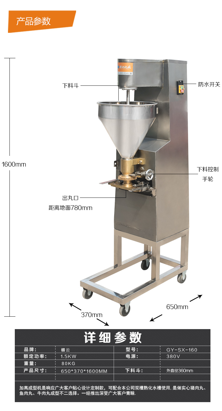 本款160型實心肉丸成型機是在120型實心肉丸成型機的基礎上加高設計,生產的肉丸具有密度小,圓度小,外表光滑等特點,深受客戶喜愛,適合餐廳、飯店、肉食加工廠使用,還會贈送您獨特的配方,肉丸成型機助您快速的占領市場。本款實心肉丸成型機是在120型實心肉丸成型機的基礎上加高設計,是配合我司設計的雙加熱水槽而設計,隨機配15、20、25MM三套成型模具,可做三種規格丸子,采用絞龍推料擠壓,切刀快速切割成型原理設計。隨肉丸成型機帶有詳細的操作說明。