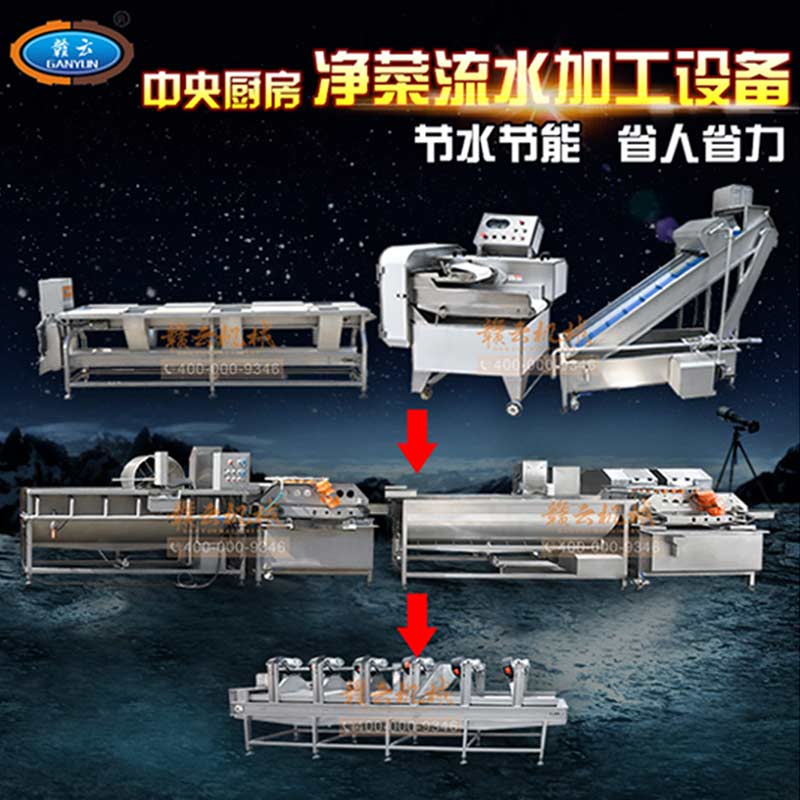 贛云掌握中央廚房?jī)舨嗽O(shè)備核心技術(shù),本套設(shè)備由分選輸送設(shè)備、數(shù)字多元化切配設(shè)備、提升機(jī)設(shè)備、渦流臭氧清洗去農(nóng)藥殘留設(shè)備、高頻振動(dòng)機(jī)、渦流清洗機(jī)、風(fēng)干機(jī)等組合而成。