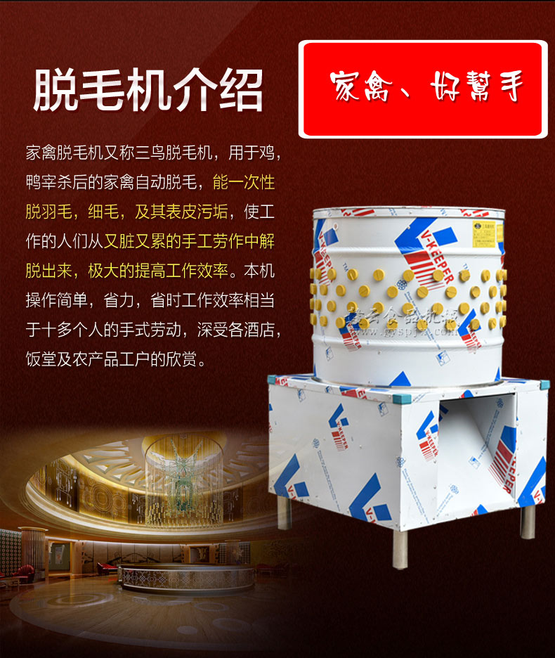 我們生產(chǎn)的這款打雞鴨毛的機(jī)器內(nèi)置的都是國標(biāo)銅芯電機(jī),可以供您用很久很久,每一臺(tái)全自動(dòng)家禽褪毛機(jī)出廠之前都是經(jīng)過了測試的,確保每一臺(tái)的實(shí)用性,加工廠雞鴨脫毛機(jī)操作簡單方便,只需要將燙好的雞鴨扔進(jìn)去啟動(dòng)機(jī)器即可,雞鴨鵝脫毛機(jī)器一直以來都是非常受歡迎的好設(shè)備,有需要的可隨時(shí)撥打電話。8373422對于全自動(dòng)家禽褪毛機(jī)我們是全國聯(lián)保一年的,無論您是在哪個(gè)城市均可以,一直以來我們都以生產(chǎn)加工廠雞鴨脫毛機(jī)為主要目標(biāo),現(xiàn)如今雞鴨鵝脫毛機(jī)器已經(jīng)深得大眾的支持和好評(píng)了,打雞鴨毛的機(jī)器現(xiàn)已紅遍大江南北,成為食品加工業(yè)不可缺少的一款設(shè)備,更多詳情歡迎隨時(shí)來電。