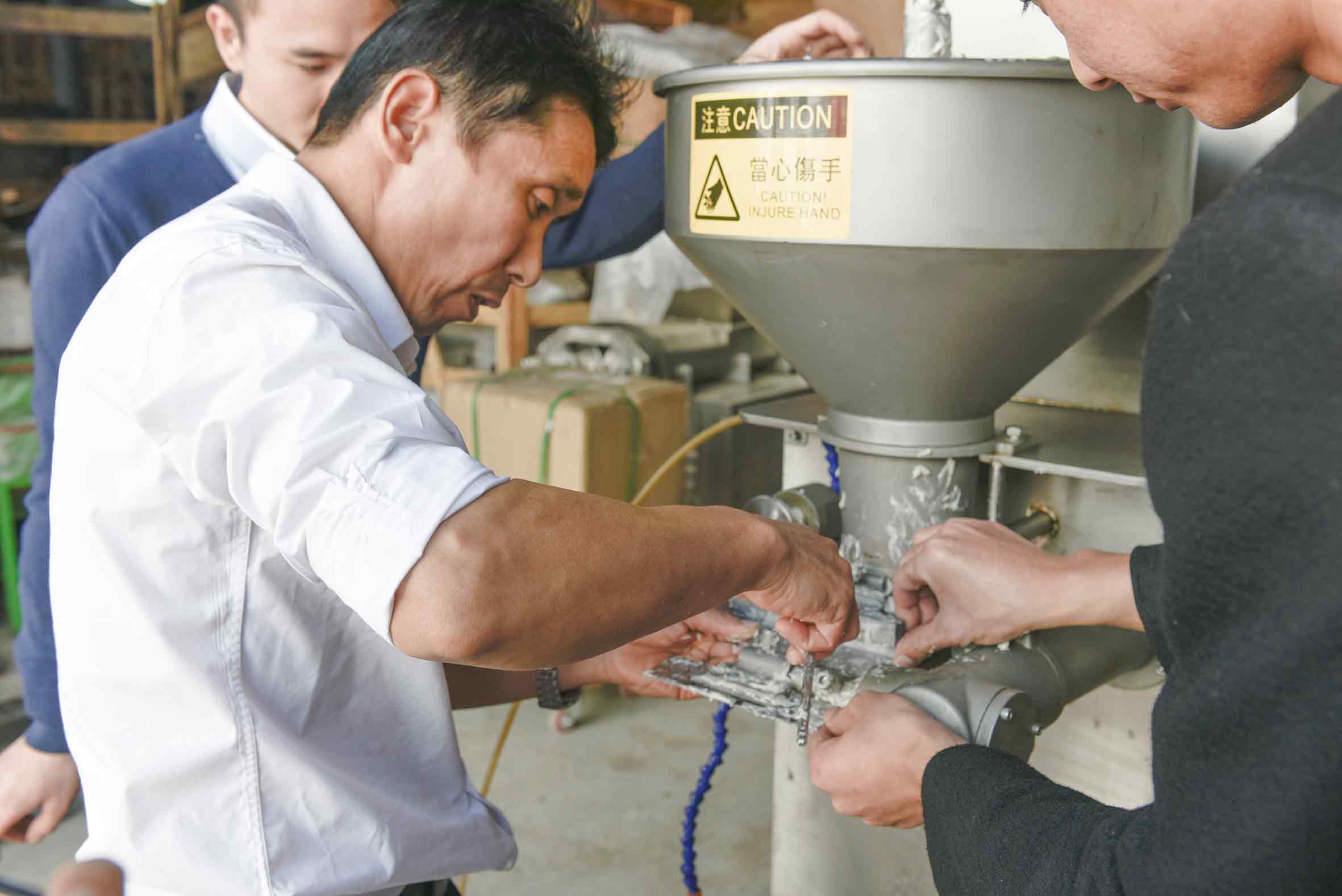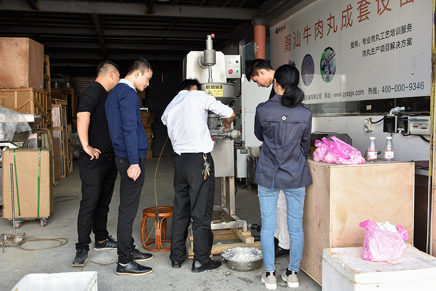客戶看到丸子調(diào)整的過程,便來了興致要向技術(shù)人員學習如何調(diào)機器,客戶現(xiàn)場調(diào)整肉丸成型刀片。