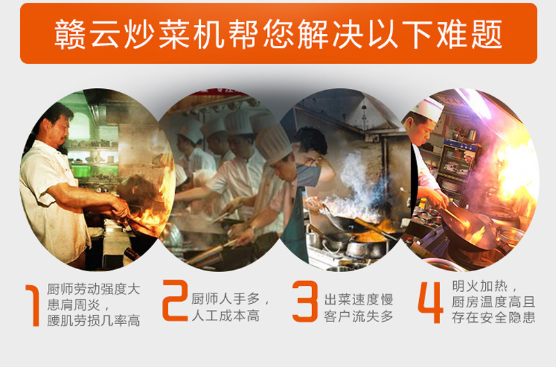 贛云炒菜機,全自動翻炒,不必人工翻攪,在炒菜期間不會有飛濺,給人輕松,安全的感覺。減輕工作人員勞動強度,減少傷病同時,提高工作效率。