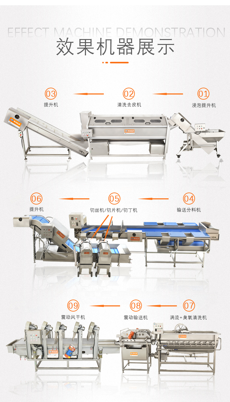 他集浸泡機,清洗機,提升機,切割機,風干機等多種機器為一體,實現(xiàn)了瓜果從剛摘到可下鍋炒的全部過程,完美的節(jié)省了人力及時間,下面的圖片將詳細介紹這些設(shè)備。