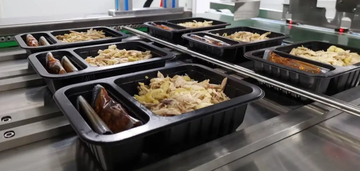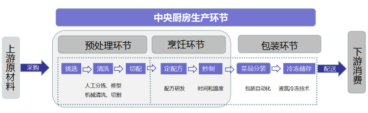 預(yù)制菜工藝流程:粗加工、細(xì)加工、加熱烹調(diào)、包裝、冷卻、配送等六個環(huán)節(jié)。