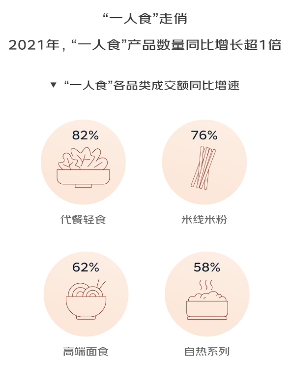 數(shù)據(jù)顯示,2021年代餐輕食品類成交額同比增長82%,同時女性群體的兒童速食成交額同比增長78%。所以,建議新入局企業(yè)可聚焦這類需求,在產(chǎn)品設(shè)計上突出健康和便捷,通過短視頻等新型消費渠道精準(zhǔn)對接這些消費者。