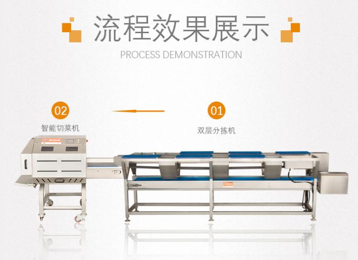 蔬菜經人工挑選預處理后放入相應分選輸送帶,輸送至多元化數字切菜機中進行切割,并由提升機提升至渦流振蕩清洗機內進行清洗,利用臭氧發生器保證物料的鮮度,后經高頻振蕩機沖洗過濾,為避免氧化變質,可真空包裝并冷鮮保存。