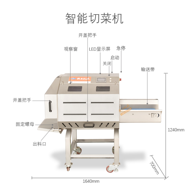 數字多元化切配設備利用斬刀快速切割原理設計,適合各類葉菜類,球根類的切割工序,厚度1-60mm(可單獨定制)范圍內變頻可調,適合多元化中央廚房與食堂切配之用。